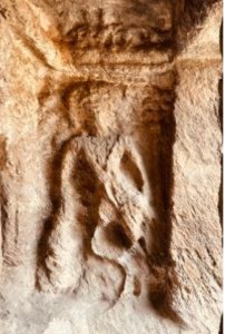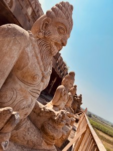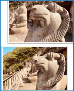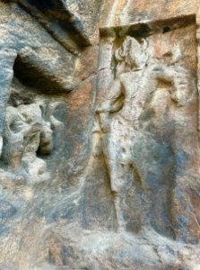 The cave temple’s second floor has intriguing sculptures of Rishis (sages) and lions which I have never seen elsewhere. The Rishis are sitting with their back to the temple and overlooking the hills ahead. The lions have ferocious disposition from the front and a comical appearance from the sides. The sculptures and carvings at Undavalli have spectacular finesse.