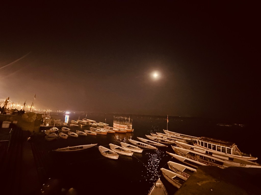 By the evening, the boats come to a halt and queue up along the ghats. I could capture a beautiful sight of these empty boats, mostly white in colour on a full moon night looking graceful and delightful.